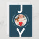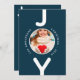 A simple modern minimalist Christmas card in blue and white. On the front: A classic blue background, with the word JOY written with white bold letters. The letter O is used as a photo frame. Personalize and add your own family photo, name and year.