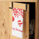This kitchen towel is shown in white with a lovely strand of red and white ornaments hanging from red berries along with red text of Merry Christmas.