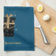 This kitchen towel is shown in teal blue with a short stack of black and gold coloured Christmas packages along with matte gold coloured text of Merry Christmas.