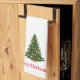 This kitchen towel is shown in white with a classic Christmas tree adorned with ornaments in red, green and gold along with red text of Merry Christmas.