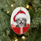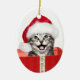 Silver or grey tabby kitten in a Christmas gift box wearing a Santa hat sends wishes of a Merry Christmas photo holiday Christmas ornament