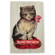This design features a vintage image of a kitten sitting on a red pillow and wearing a red bow.