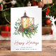 Elegant seasonal folded greeting card featuring a watercolor illustration of a Christmas candle lantern in an arrangement of seasonal pines, eucalyptus, berries and greenery. "Happy Holidays" is written in a contemporary red script and you can personalize your name in simple modern typography. Customize a message on the inside or leave blank.