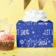 White LET IT SNOW text with snowflakes on a blue background.