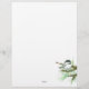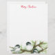 Christmas greetings letterhead stationery featuring three chickadees in an evergreen tree painted with watercolor and accented with red watercolor spatter spots. On the back is another little chickadee and bright red text that you can edit to fit your needs.