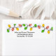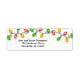 Bright Christmas lights in red, green and yellow lay across the top of the label. Their glow reflecting on the white background. A great return label for the holidays.