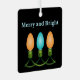Three colourful holiday light bulbs all in a row are featured in the Christmas graphic decorating this ornament in hues of orange and blue with green cords between.