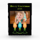 Three colourful holiday light bulbs all in a row are featured in the Christmas graphic decorating this easy to customize photo block in hues of orange and blue with green cords between. Placeholder Photo credit: Photography © Storytree Studios, Stanford, CA