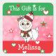 Cute Christmas Gift Tag. Little hand drawn cartoon llama with winter hat on with green and red background with stars and hears and the text, "This gift is for." Just add the recipient's name in the personalize area.
