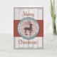 Pretty holiday greeting with round reindeer emblem and snowflakes along a rust red banner that runs width of card. Rustic white illustrated fence planks brighten up the background. A lovely way to wish your massage therapist a Merry Christmas.