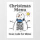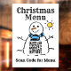 Christmas QR Code Menu Window Cling Sign. Image is a Snowman with QR Code