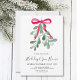 It is decorated with watercolor green mistletoe, a red ribbon, and stylish script typography.