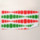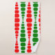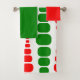 This towel set has a mid-century modern design of red and green rounded rectangles in increasing and decreasing size running vertically on a field of white.