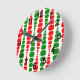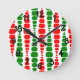 This Christmas wall clock has a mid-century modern design of red and green rounded rectangles in increasing and decreasing size running vertically on a field of white.