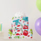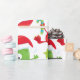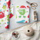 Fun, silly, colourful holiday wrapping paper features Christmas monsters with Santa hats, gifts, reindeer antlers, stars, and candy canes on a white background.