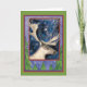Lovely Christmas design with greens, purple, and dark blue. With Christmas trees at the bottom and a moose in the center. Splashes of red as part of the frame