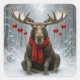 In a snowy forest, a moose sits gracefully, adorned with a bright red scarf and festive red baubles hanging from its antlers