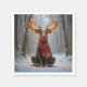 A moose sits in a snowy forest, its antlers adorned with glowing lights, and wearing a bright red scarf that adds a festive touch