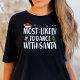 Do you have the irresistible urge to dance with Santa when he slides down your chimney? Is your Christmas spirit so infectious that even St. Nick himself can't resist a dance-off? Embrace the holiday groove with our "Most Likely to Dance With Santa" Funny T-Shirt. Get ready to boogie down with Santa and spread laughter this holiday season.