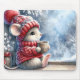 A cozy mouse in a red sweater and hat sits by a frosted window holding a cup of hot cocoa while admiring a snowy landscape with pine trees and snowflakes