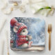 A cozy mouse in a red sweater and hat sits by a frosted window holding a cup of hot cocoa while admiring a snowy landscape with pine trees and snowflakes