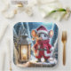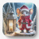 A cute mouse dressed in a Santa outfit stands on a snowy tree stump beside a glowing lantern