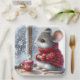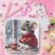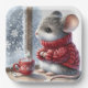 A small mouse wearing a red knitted sweater sits by a frosty window with a steaming cup of cocoa adorned with snowflake pattern