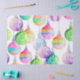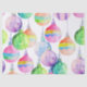 Pretty tissue paper for your holiday gifts featuring watercolor Christmas ball ornaments hanging from strings at various levels; pink, yellow, blue, and green, in various tones and shades, creating a shiny, reflective look, all on a white background.