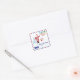 Wrap up your holiday gift with a pretty square seal that features a square envelope with borders in dark blue and red. It has an illustration of Santa Claus in the snow waving near a white tree and a snowman. There’s a small blue label that reads “AIR MAIL PAR AVION “ because all mail from the North Pole is a priority. It must arrive in time for Christmas! This Express Mail envelope has two colourful stamps: in one, there are a snowglobe and Christmas presents, on the other, there’s a Christmas wreath with a yellow bow and red bells. Santa likes to use snail mail. He’s kind of an old-fashioned guy!