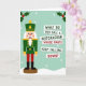 On this Christmas card, you'll find a cheerful nutcracker in a fancy green outfit with gold details, red pants, and black boots, smiling big with a white beard. The background is a soft green with white snowflakes, making it feel like winter❄️. Green holly with red berries sits at the top corners, adding to the festive look🌿. One side has a joke: "WHAT DO YOU CALL A NUTCRACKER WHOSE PANTS KEEP FALLING DOWN?" in green and red🤣. It's funny and makes you smile😄! This card is perfect for spreading holiday joy and making people laugh🎄🎁.