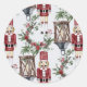 Watercolor painting of traditional Christmas decorations with nutcrackers, wreaths and lanterns.