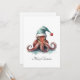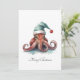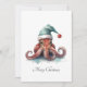 watercolor painting of a cute pink octopus wearing a turquoise winter hat in christmas style