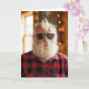An old man wearing a red and black plaid shirt has a white beard humorously tucked up under dark sunglasses.