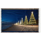 A row of lit Christmas trees along the beach against a beautiful blue sky decorated for the Christmas season!
