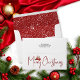 Christmas ornament red Merry Christmas typogrpahy holiday envelope. It features the "Merry Christmas" typogrpaphy and a red Christmas ball ornament with a red bow and branches on the back. The inisde features a pattern with white snowflakes on red.