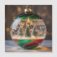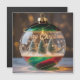A detailed, close-up photograph of an elegant glass Christmas bauble designed to look like a miniature snow globe. Inside the clear globe, three miniature bottlebrush Christmas trees are nestled in white faux snow. The glass exterior features decorative swirls of deep red and emerald green paint, and the words "Merry Christmas" are written in a white cursive font across the front, along with small snowflakes. The background is blurred with warm, golden bokeh lights, creating a soft, magical, and festive atmosphere.