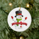 Christmas Ornament shown in a round shape and is made of porcelain with a white background colour and with a festive holiday snowman print design.