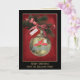 Gold Christmas ornament hanging form pine bough with Holy Bible and red poinsettia flower in black frame.