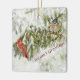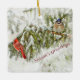 Beautiful Christmas ornament featuring a cardinal and blue jay perched on snow covered pine branches.