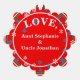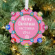 Prettyy light pink background with colourful ornament balls in red, gold, blue, p;ink in circular pattern. Merry Christmas is written in white snowcapped typography against light pink background. Girl's Name is written in white colour. Insert Year. Backside is red colour with Love, Name(s) and YEAR written in white, with blue white snowflakes, and red white green lines pattern. Original Artwork Design by TamiraZDesigns.