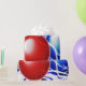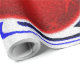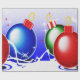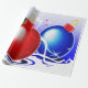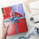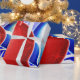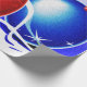 This image portrays Christmas balls in red, blue and green. Ribbons and stars in white, blue and red are seen throughout. A blue backround was added. A glitter was added to this design. This Christmas wrapping paper is available in assorted styles and sizes.