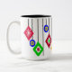 This mug has a collection of ornaments hanging down made of diamond shapes, circles, and stars.