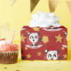 Christmas wrapping paper Personalized design with illustration of a head of cute panda with Santa's hat, in red circle, with yellow pattern with stars, Christmas holidays design for children,, with customizable text template for your name or message; illustrated by Radka Kavalcova