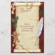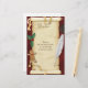 An illustration of a parchment scroll on a red velvet background. It is surrounded by ribbons, holly, a gingerbread man, a candy cane and a feather and ink bottle.You can customize it with your own text or leave it blank.
