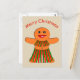 This postcard features a cute cartoon of a colourful gingerbread woman. She has black eyes with white pupils and pretty black eyelashes and a big smile on her face. She also has red and green tassels on her skirt and top ready for a Christmas party.