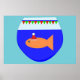 This poster features a fun orange Christmas goldfish wearing a festive santa hat. The goldfish is swimming in the blue water of its goldfish bowl. The fish has decorated the top of the bowl with red and green bunting flags that spell out the message "Merry Fishmas". This fun seasonal fish is ready for a big Christmas party.