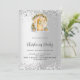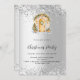 An elegant faux silver looking background and confetti. Decorated with a cozy entrance decorated with a Christmas tree and green pine decor. Christmas Party written with modern and trendy large hand lettered style script. Personalize and add your party information.