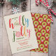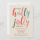 Holly jolly Christmas party personalized invitations created using hand drawn watercolor Christmas ornaments mixed mixed with multicolor typography on the front and kitschy wreaths on the back. Original art by Leslie Larson.