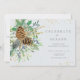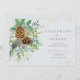 Pine cones and winter foliage bouquet of holly, berries, mistletoe, spruce and juniper take centre stage in this holiday Christmas invite. And a a gold boho tribal arrow and twinkling gold glitter adds come glam modern chic