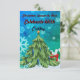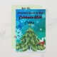 Beautiful blue and green snowflake background with a simple Christmas tree with a golden star & blue ornaments, and a small gift peeking out from behind. The back has a solid background with a small graphic of Santa in the bottom corner.